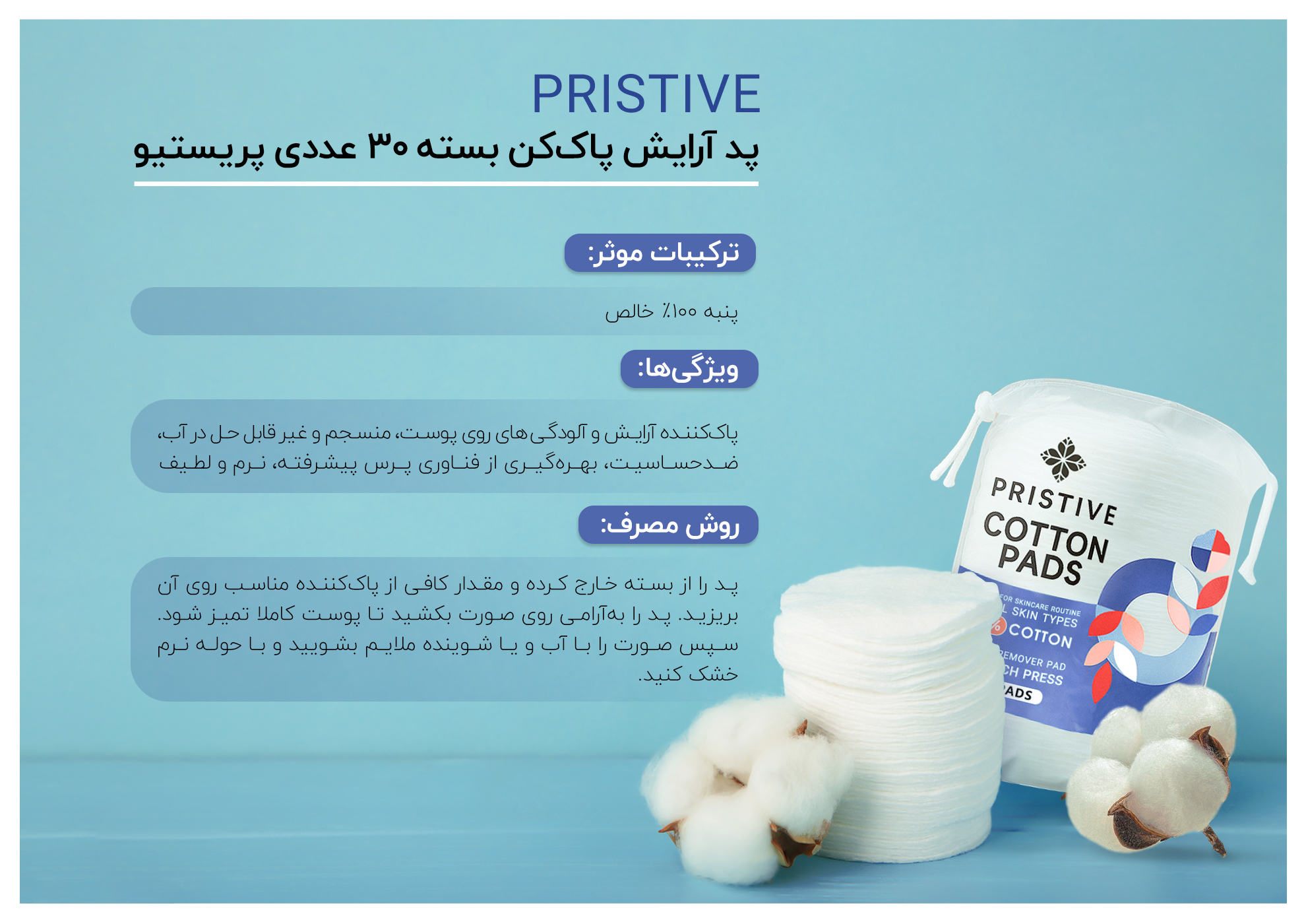 پد آرایش پاککن بسته 30 عددی پریستیو، محصولی بسیارکاربردی برای استفاده به همراه تونر، میسلار واتر، محلول آرایش پاککن و شیرپاککن است. این پدها از پنبه ۱۰۰٪ خالص بهصورت منسجم تولید شدهاند و در آب حل نمیشوند. این محصول با کیفیت بالا و قدرت جذب مناسب، فاقد هرگونه مواد شیمیایی بوده و گزینهای مؤثر برای استفاده روزانه در روتین پوستی بهشمار میرود.