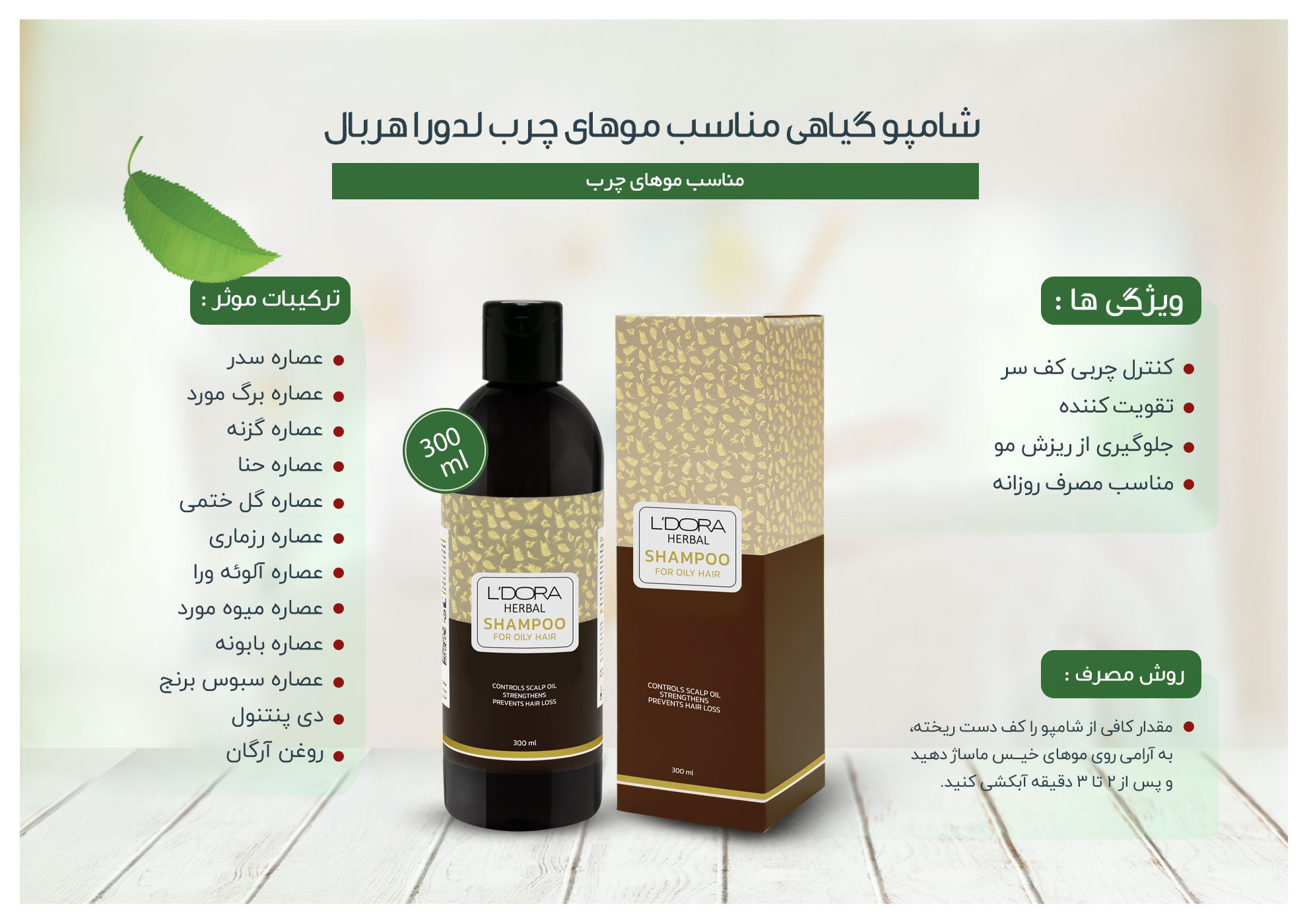 شامپو گیاهی مناسب موهای چرب لدورا هربال، یک محصول حرفهای است که برای موهای چرب طراحی شده است. عصارههای گیاهی و ترکیبات موجود در این محصول گیاهی با ملایمت مو را تمیز، تقویت و احیا کرده و به حفظ تعادل چربی کف سر کمک میکند. این شامپو با ترکیبات گیاهی خود مانند عصارههای سدر، برگ مورد، حنا، گزنه، گلختمی، رزماری، آلوئهورا، میوه مورد، بابونه، سبوس برنج و دیپنتنول و روغن آرگان تأثیر شگفتانگیزی در لطافت، درخشندگی، تقویت مو و کاهش میزان چربی پوست سر دارد.