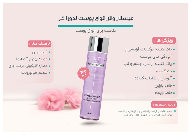 ویژگی ها:: پاککننده ترکیبات آرایشی و آلودگیهای پوست، پاککننده آرایش چشم و لب، نرمکننده، آبرسان و شادابکننده، فاقد پارابن، فاقد رایحه