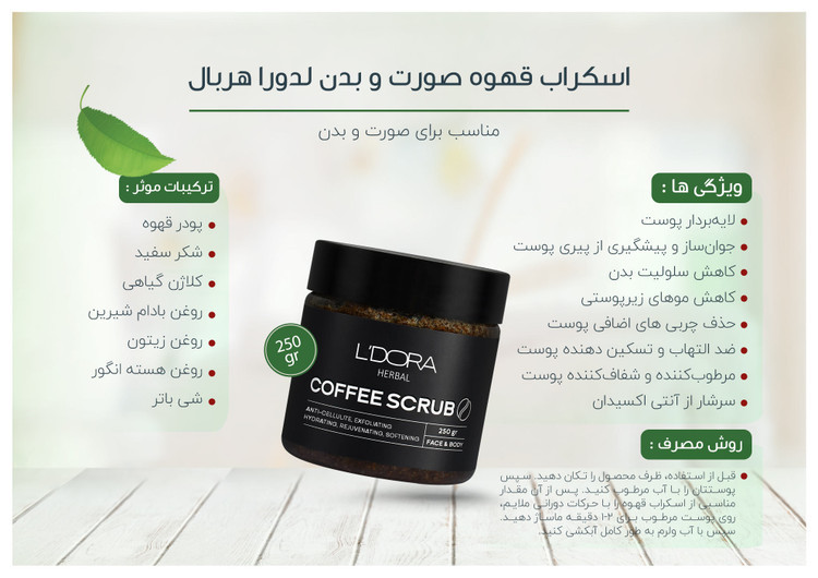 اسکراب قهوه صورت و بدن لدورا یک لایهبردار مناسب برای پوست است. ترکیبات مؤثر و معطر بهکار رفته در این اسکراب از جمله قهوه و روغنهای طبیعی علاوه بر لایهبرداری، کاهش سلولیت و موهای زیرپوستی به آبرسانی، کلاژنسازی و جوانسازی پوست کمک میکند. همچنین این محصول با از بین بردن سلولهای مرده، باعث نرمی و لطافت پوست میشود. کافئین موجود در پودر قهوه علاوه بر افزایش گردش خون، رطوبت را از لایههای پایینتر به سطح پوست رسانده و پوست را شاداب و باطراوت میکند.