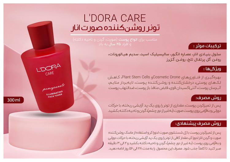 تونر روشنکننده صورت انار با بهرهگیری از فناوریهای Cosmetic Drone و Plant Stem Cells برای شناسایی، کنترل و کاهش لکهای پوستی به کار میرود. سلولهای بنیادی انار ماده موثره اصلی این محصول، سرشار از ویتامین C، آنتیاکسیدانهای قوی، اسیدهای آمینه، اسیدهای چرب و مواد معدنی میباشد. این تونرِ روشنکننده، برای تمیز کردن، لایهبرداری، آبرسانی و شفافیت پوست مناسب است. این محصول، حاوی عصارههای طبیعی بوده که نقش بسزایی در کاهش لکهای پوستی و درخشندگی طبیعی پوست داشته و علاوه بر این به نرمی، لطافت و جوانسازی پوست کمک میکند. سدیم هیالورونات موجود در این تونر، پوست را به طور عمقی آبرسانی کرده و ترکیباتی مانند روغن گل پرتقال تلخ و روغن گل رز موجب کنترل تولید سبوم اضافی و بازسازی پوست میشود.
